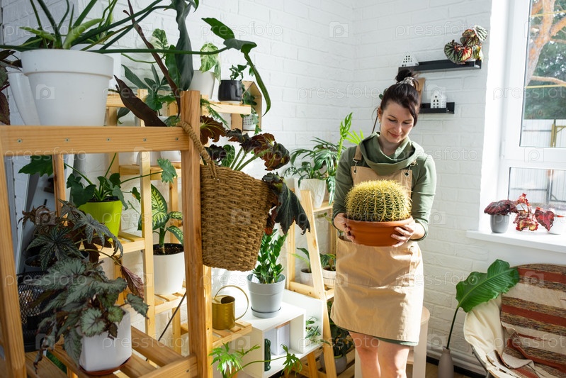 Большой эхинокактус Грузони в руках женщины в интерьере оранжереи со стеллажными коллекциями домашних растений. Домашнее растениеводство, селекционер любуется кактусом в горшке