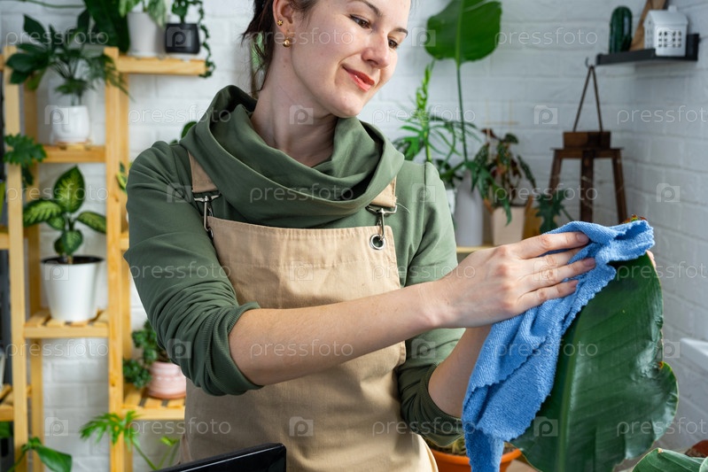 Женщина вытирает тряпкой пыль с листьев домашних растений в горшках, с любовью выращенных на полках в интерьере дома. Домашнее растениеводство, теплица, чистота и здоровье растений