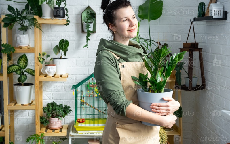 Неприхотливый и популярный замиокулькас в руках женщины в интерьере теплицы со стеллажами из коллекций домашних растений. Домашнее растениеводство, селекционер любуется кактусом в горшке