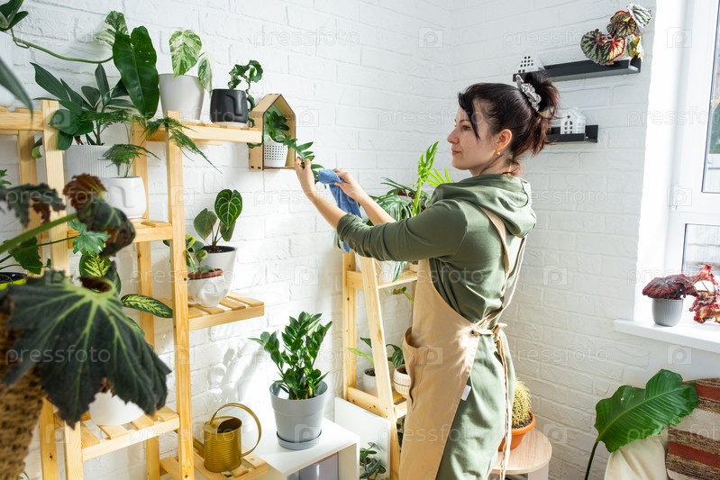 Женщина вытирает тряпкой пыль с листьев домашних растений в горшках, с любовью выращенных на полках в интерьере дома. Домашнее растениеводство, теплица, чистота и здоровье растений