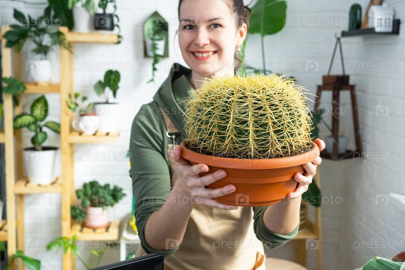 Большой эхинокактус Грузони в руках женщины в интерьере оранжереи со стеллажными коллекциями домашних растений. Домашнее растениеводство, селекционер любуется кактусом в горшке