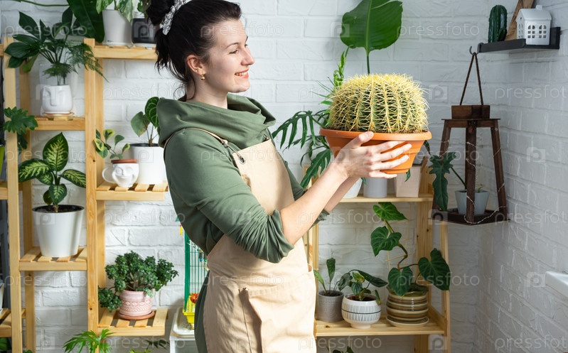 Большой эхинокактус Грузони в руках женщины в интерьере оранжереи со стеллажными коллекциями домашних растений. Домашнее растениеводство, селекционер любуется кактусом в горшке