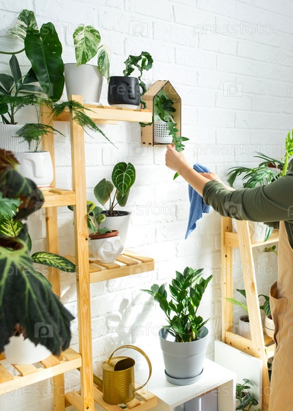Женщина вытирает тряпкой пыль с листьев домашних растений в горшках, с любовью выращенных на полках в интерьере дома. Домашнее растениеводство, теплица, чистота и здоровье растений