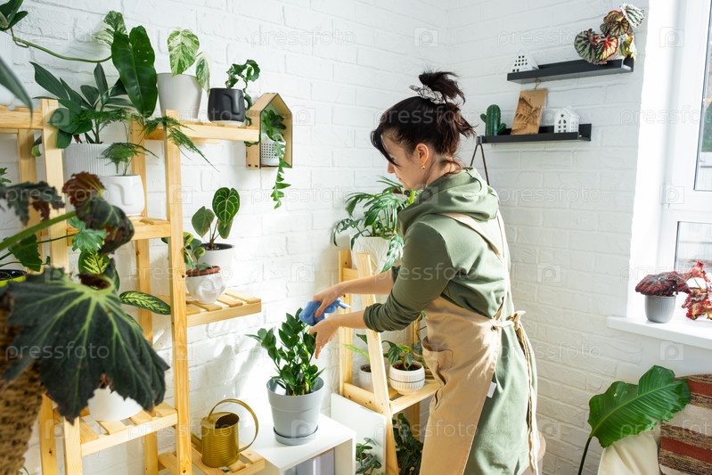 Женщина вытирает тряпкой пыль с листьев домашних растений в горшках, с любовью выращенных на полках в интерьере дома. Домашнее растениеводство, теплица, чистота и здоровье растений