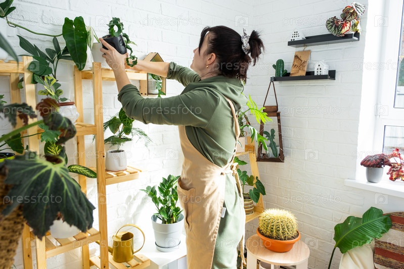 Женщина-селекционер осматривает и любуется домашними растениями в горшке из своей коллекции дома на полках. Поиск вредителей, уход, полив, удобрения. Домашнее растениеводство
