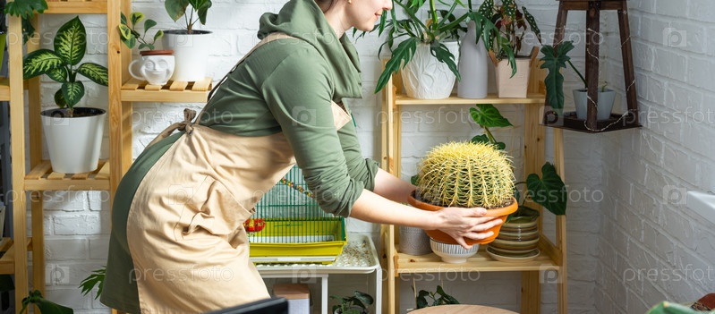 Большой эхинокактус Грузони в руках женщины в интерьере оранжереи со стеллажными коллекциями домашних растений. Домашнее растениеводство, селекционер любуется кактусом в горшке