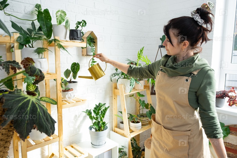 Женщина поливает домашние растения из своей коллекции редких видов из лейки, с любовью выращенной на полках в интерьере дома. Домашнее растениеводство, теплица, водный баланс