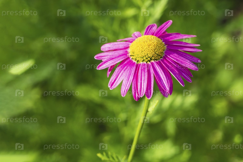 Крупный план красочной розовой ромашки на зеленом фоне в солнечный день в саду. Ярко-желтая сердцевина маргаритки окружена светло-розовыми лепестками на расфокусированном естественном зеленом фоне