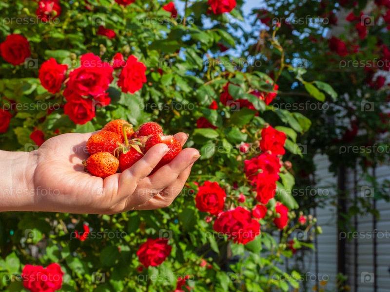 Женская рука держит на ладони красную сочную спелую клубнику в яркий солнечный день на фоне цветущего розового куста. Органическая клубника из вашего сада
