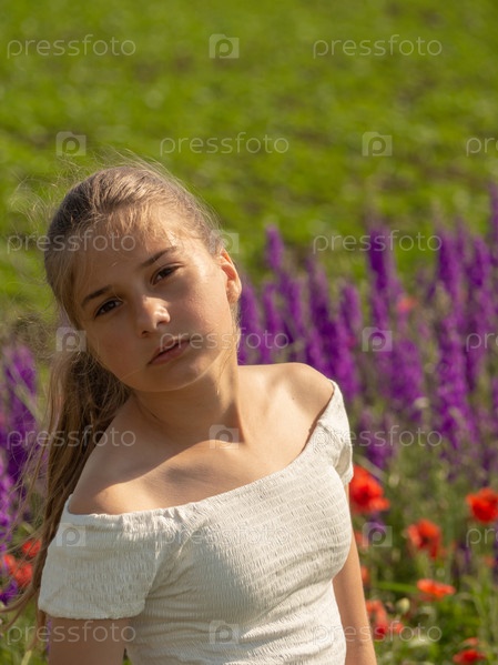 Красивая девушка стоит на поле с цветущими люпинами и маками