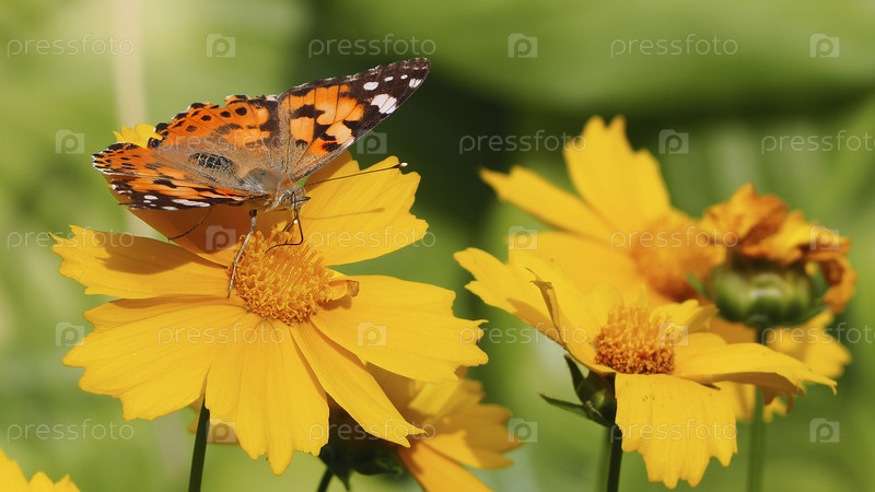 Красивая бабочка пьет нектар на желтом цвете на зеленом фоне.Бабочка Ванесса Кардуи сидит на жёлтом цвете и пьёт нектар своим хоботком