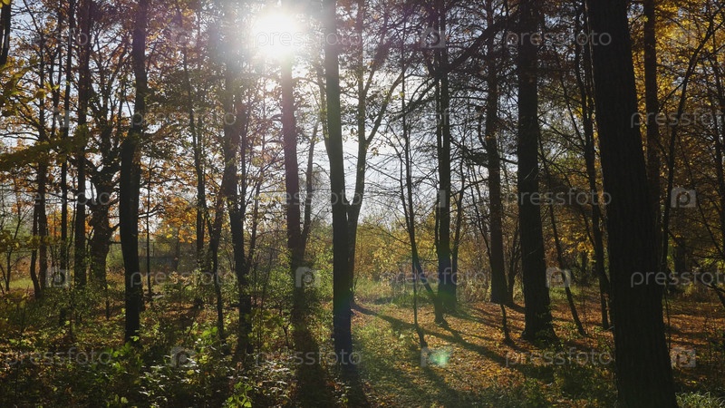 Осенние листья падают в лес, природный ландшафт