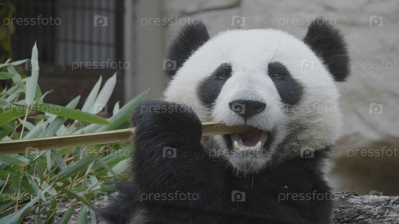 Панда ест сочные бамбуковые ветки на обед