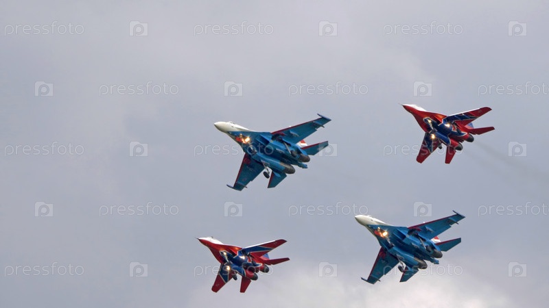 МОСКВА, РОССИЯ - 7 мая 2021 года: Авиапарад в Москве. группа реактивных истребителей МиГ-35 и Су-30 в небе на параде Победы во Второй мировой войне в Москве, Россия
