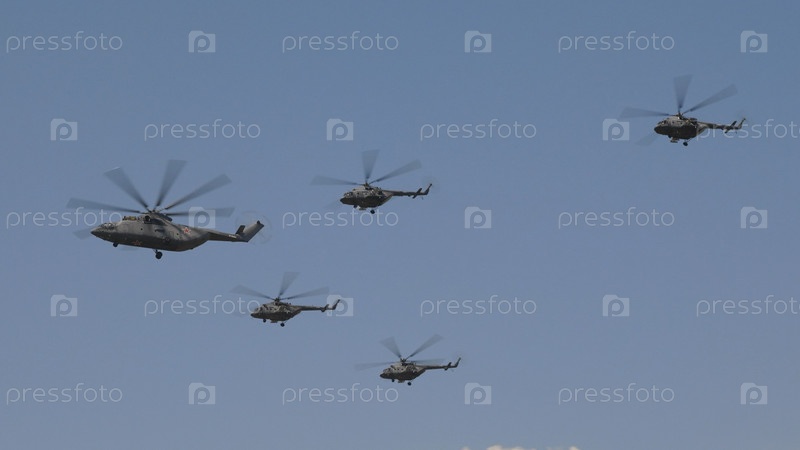 Боевые вертолеты Ми-26 и Ми-8 летят в небе на учебном параде в честь победы в Великой Отечественной войне