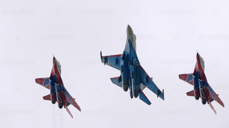 МОСКВА, РОССИЯ - 7 мая 2021 года: Авиапарад в Москве. группа реактивных истребителей МиГ-35 и Су-30 в небе на параде Победы во Второй мировой войне в Москве, Россия