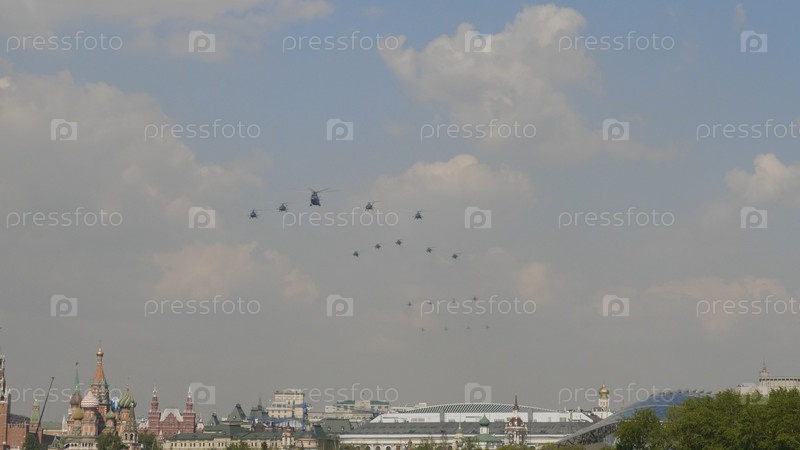 МОСКВА - 7 мая 2019 года: боевые вертолеты Ми-26 и Ми-8 летят в небе на тренировочном параде в честь победы в Великой Отечественной войне 7 мая 2019 года в Москве, Россия