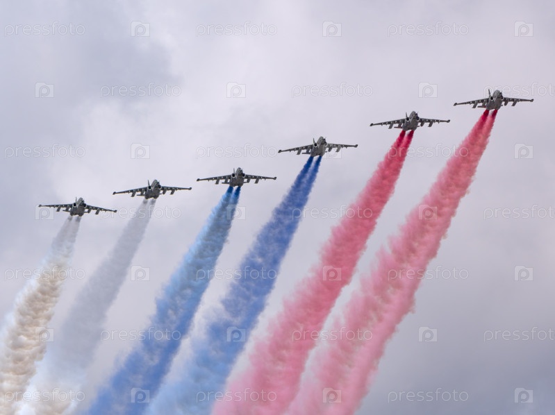МОСКВА, РОССИЯ - 7 мая 2021 года: Авиапарад в Москве. Группа российских истребителей Су-25 с раскрашенным российским флагом в небе на параде Победы во Второй мировой войне в Москве, Россия