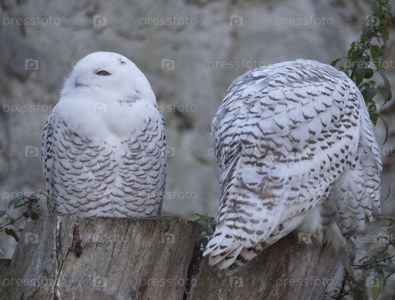 Снежная сова (Bubo scandiacus или Nyctea scandiaca) сидит на палочке