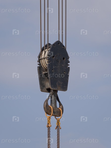 Крюк крана с висящими красными и белыми полосами, голубое небо на заднем плане