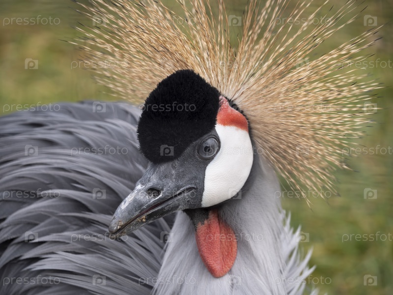 Красивая птица, серый венценосный журавль с голубым глазом и красным плетением
