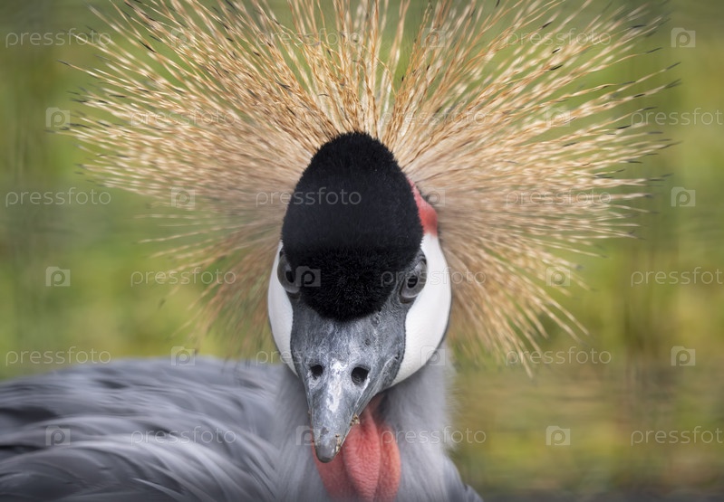 Красивая птица, серый венценосный журавль с голубым глазом и красным плетением