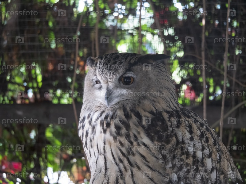 Филин сидит и смотрит на фоне листьев деревьев