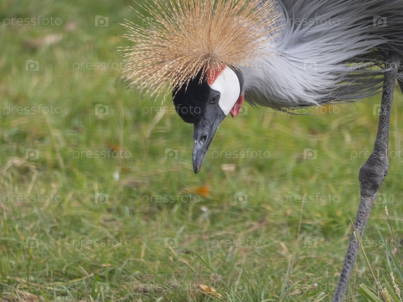 Красивая птица, серый венценосный журавль с голубым глазом и красным плетением