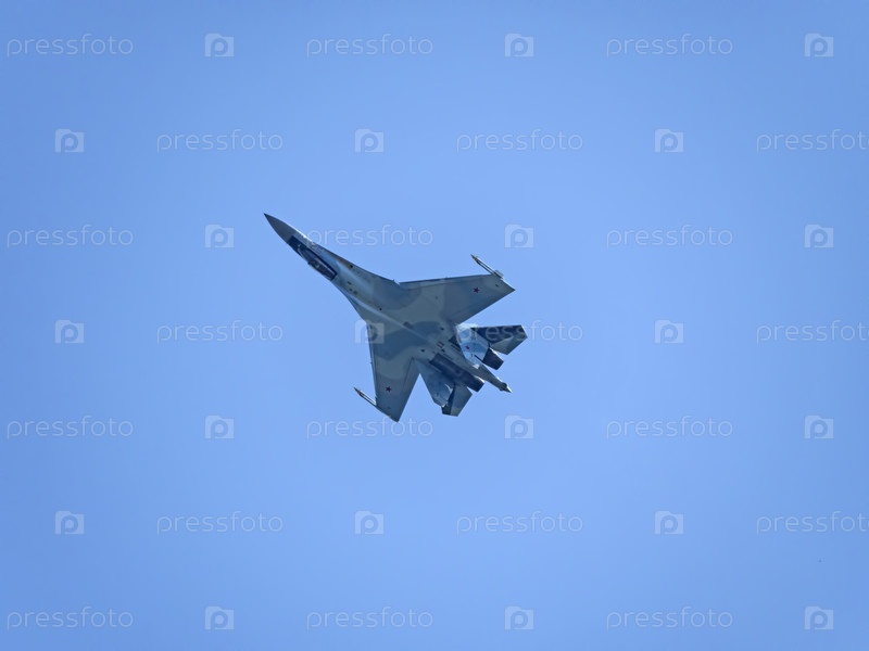 Москва Россия Аэродром Жуковский 31 августа 2019 года: пилотажный Су-35 выполняет демонстрационный полет международного аэрокосмического салона МАКС-2019