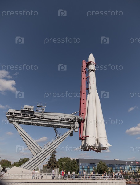 МОСКВА, РОССИЯ - 23 апреля 2019 г.: Ракета-носитель "Восток" в павильоне "Космос" на ВДНХ. Прогулки москвичей и туристов