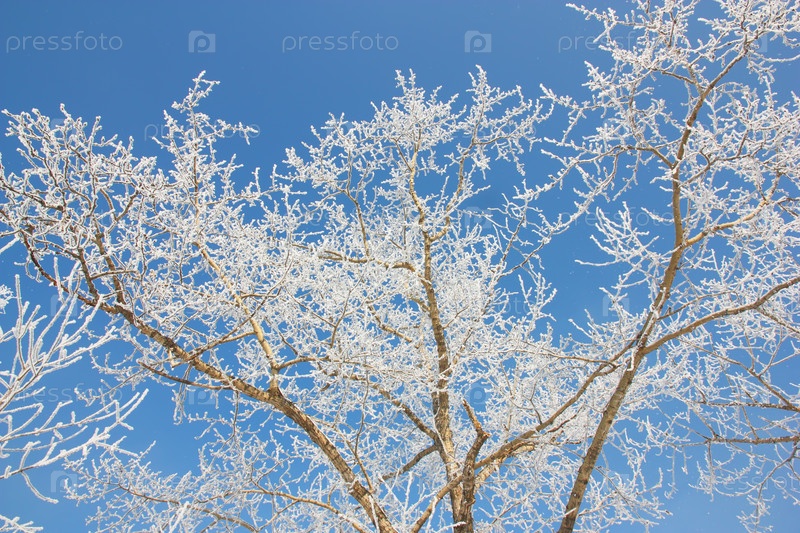Зимний березовый лес в солнечном свете на фоне голубого неба