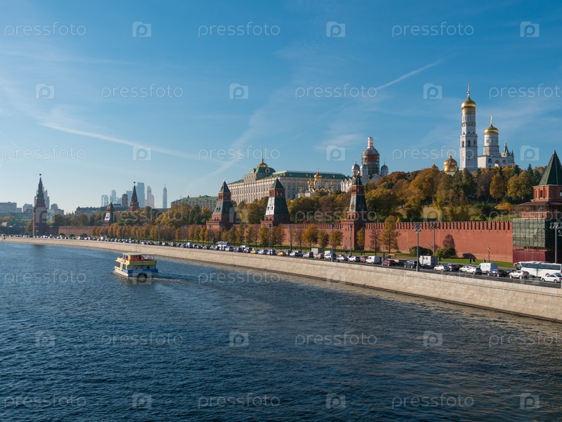 МОСКВА РОССИЯ - 25 августа 2018 г.: Солнечный летний день Московская река Кремль