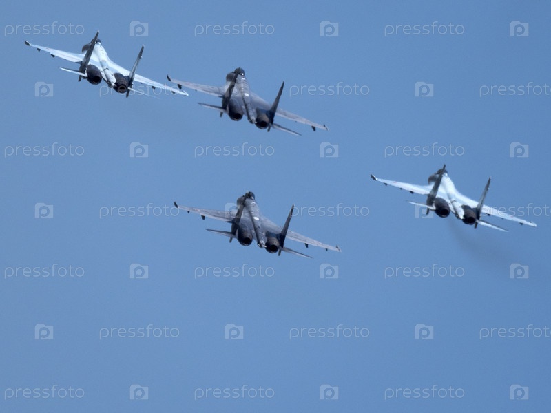 Москва Россия Аэродром Жуковский 31 августа 2019 года: Пилотажные группы "Соколы России" на самолетах Су-30 Международного аэрокосмического салона МАКС-2019