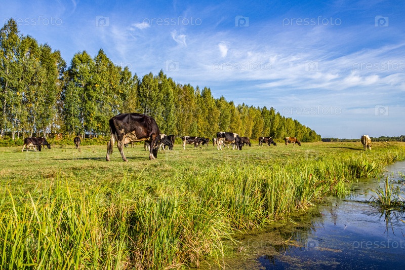 Коровы пасутся на лугу в ясный солнечный летний день в Беларуси