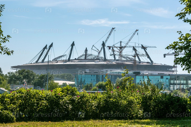 Строящийся футбольный стадион в Санкт-Петербурге летом