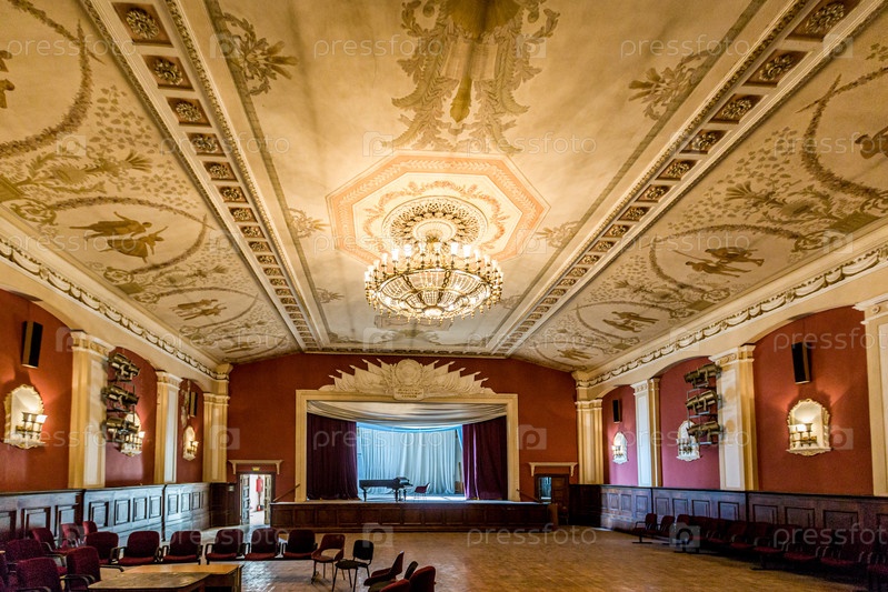 Заброшенный старый театральный зал с красивыми фресками, роялем, сценой и кулисами в Москве, Россия
