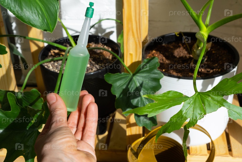 Капельное удобрение для горшечных растений, стимулятор развития, ускорение роста, уход за домашними растениями. Бутылка с жидкостью вставлена в руку женщины. Домашнее растениеводство