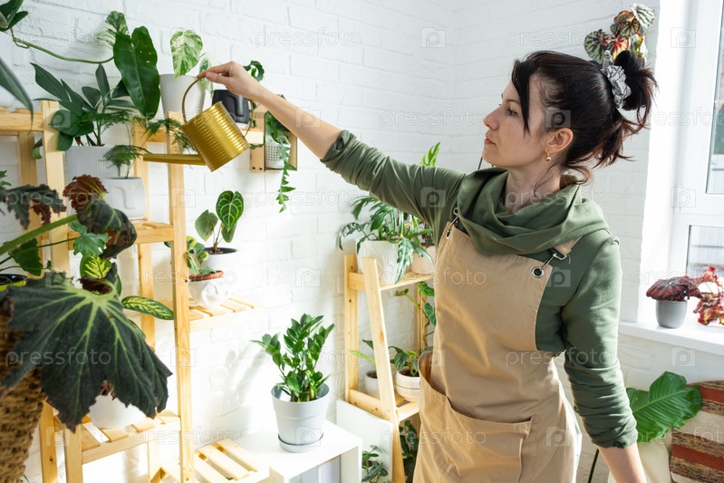 Женщина поливает домашние растения из своей коллекции редких видов из лейки, с любовью выращенной на полках в интерьере дома. Домашнее растениеводство, теплица, водный баланс