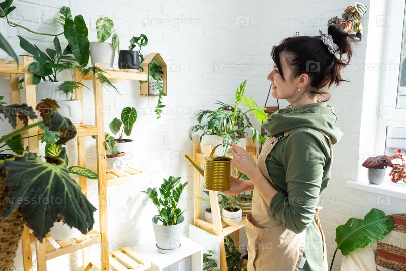 Женщина поливает домашние растения из своей коллекции редких видов из лейки, с любовью выращенной на полках в интерьере дома. Домашнее растениеводство, теплица, водный баланс
