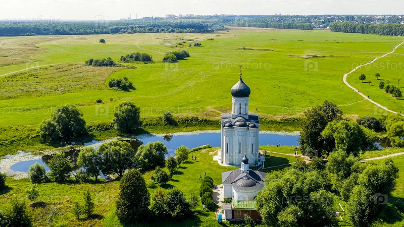 Россия, Боголюбово. Вид с воздуха на церковь Покрова на Нерли. Православная церковь и символ средневековой России, вид с воздуха