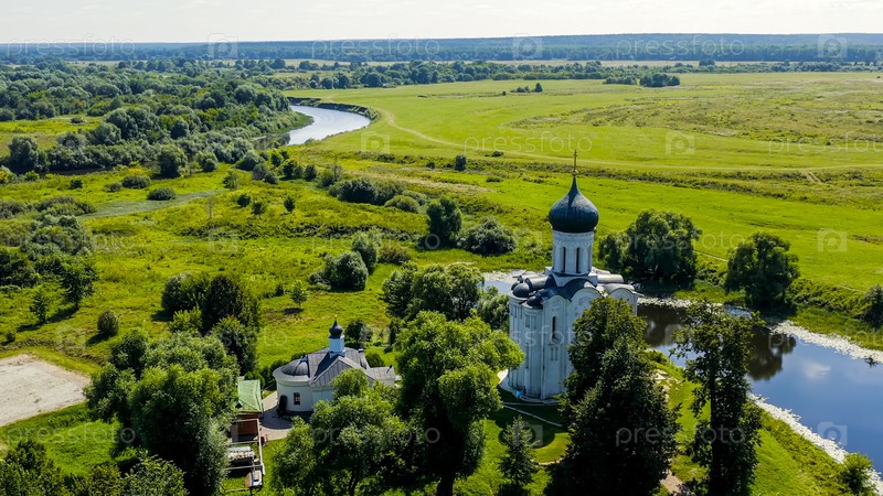 Россия, Боголюбово. Вид с воздуха на церковь Покрова на Нерли. Православная церковь и символ средневековой России, вид с воздуха