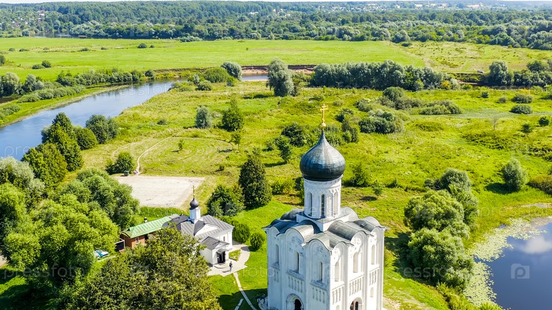 Россия, Боголюбово. Вид с воздуха на церковь Покрова на Нерли. Православная церковь и символ средневековой России, вид с воздуха