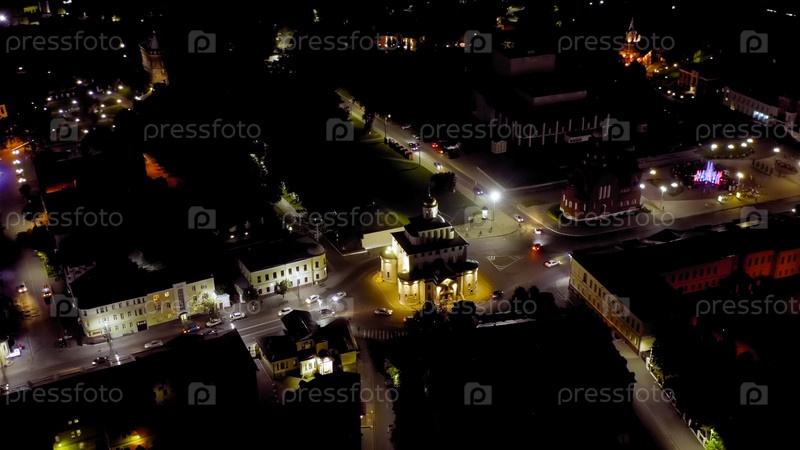 Россия, Владимир. Ночной город с воздуха. Золотые ворота (Владимир), вид с воздуха