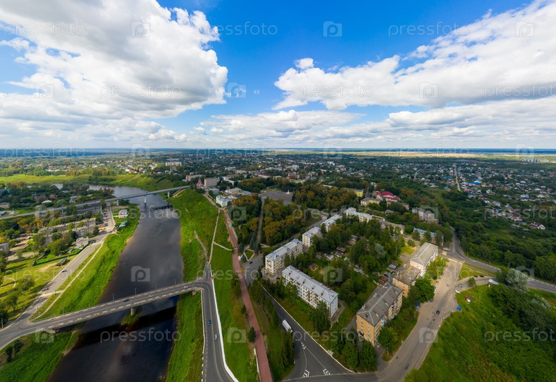 Ржев, Россия. Панорама центра города. Вид с воздуха на Волгу и набережную