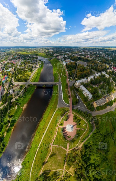 Ржев, Россия. Панорама центра города. Вид с воздуха на Волгу и набережную