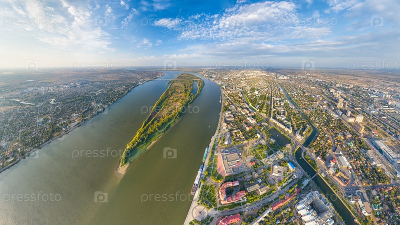 Астрахань, Россия. Панорама города с воздуха летом. Река Волга и остров Городстой. С высоты птичьего полета