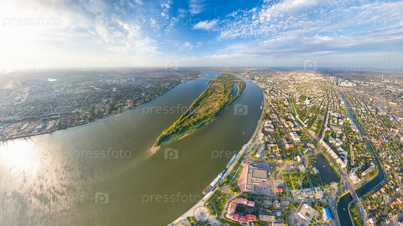Астрахань, Россия. Панорама города с воздуха летом. Река Волга и остров Городстой. С высоты птичьего полета