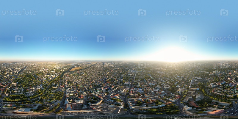 Симферополь, Крым. Город в центре Крымского полуострова, на реке Салгир. Панорама 360 с воздуха во время заката. Лето