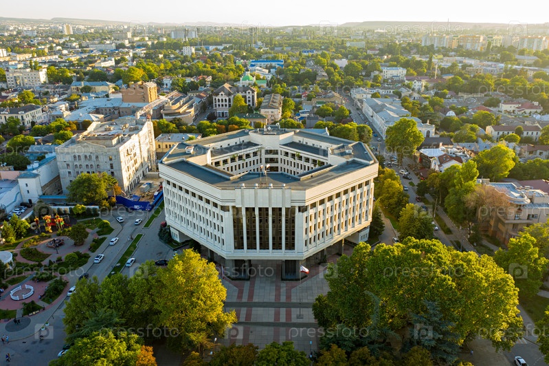 Симферополь, Крым. Государственный совет Республики Крым. Центр города. С высоты птичьего полета. Время заката. Лето
