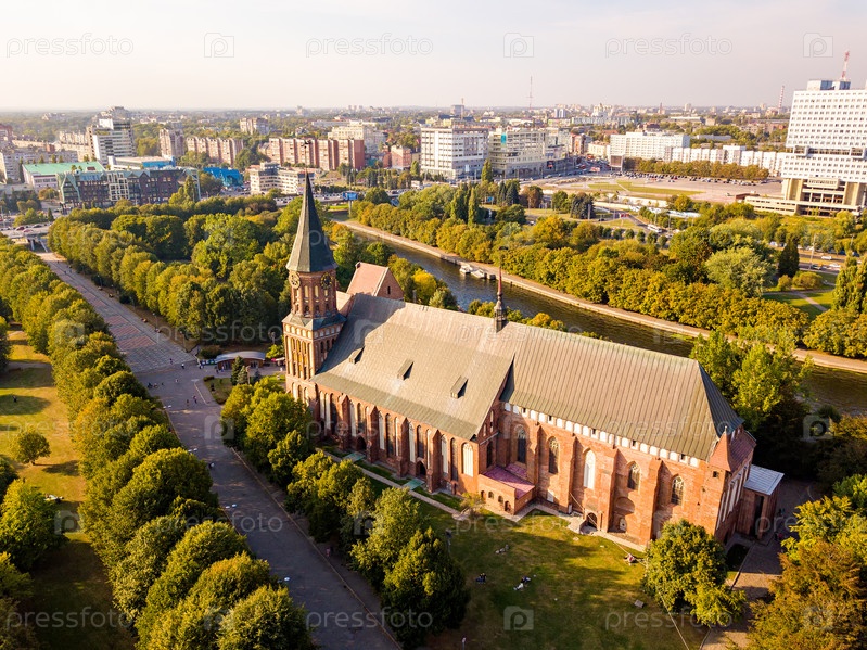 Вид с воздуха Центральная часть города Калининграда, Калининградский собор на острове Канта. Россия